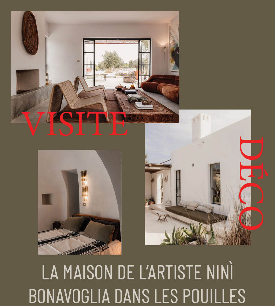 Elle est la maison du marchand d’art et artiste italien Ninì Bonavoglia, revenu à sa région natale des Pouilles. Il y a créé une maison contemporaine au milieu des oliviers. Elle ressemble à beaucoup de maisons contemporaines en Méditerranée avec de grandes ouvertures, ouvrant sur les aménagements extérieurs, mais elle est celle d’une personne à l’âme sensible, habitée par la création et l’art.
