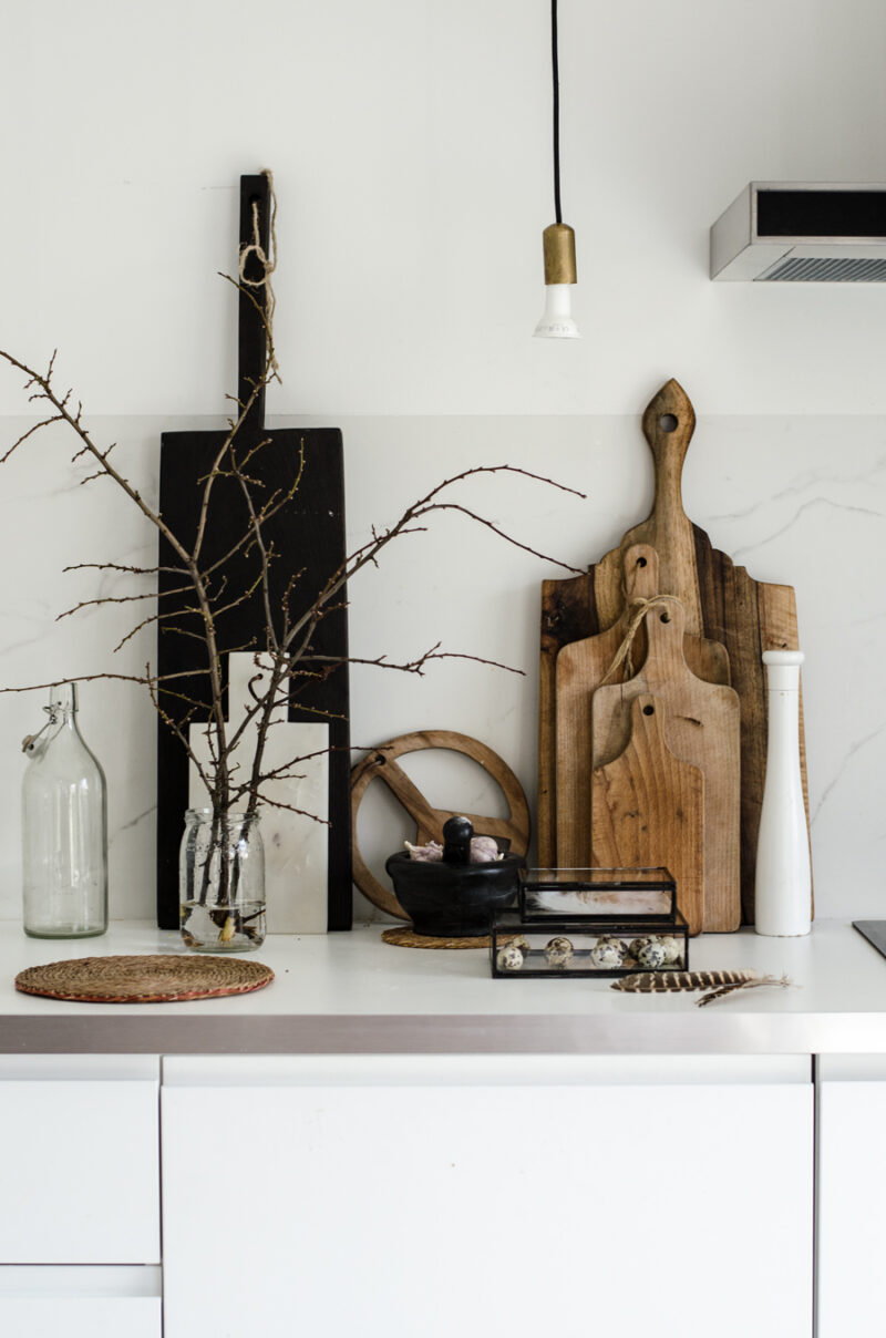 Pour apporter une touche bois brut, patiné, si on a des meubles de cuisine contemporains, une piste est de placer quelques planches de cuisine ou d’autres vieux ustensiles en bois.