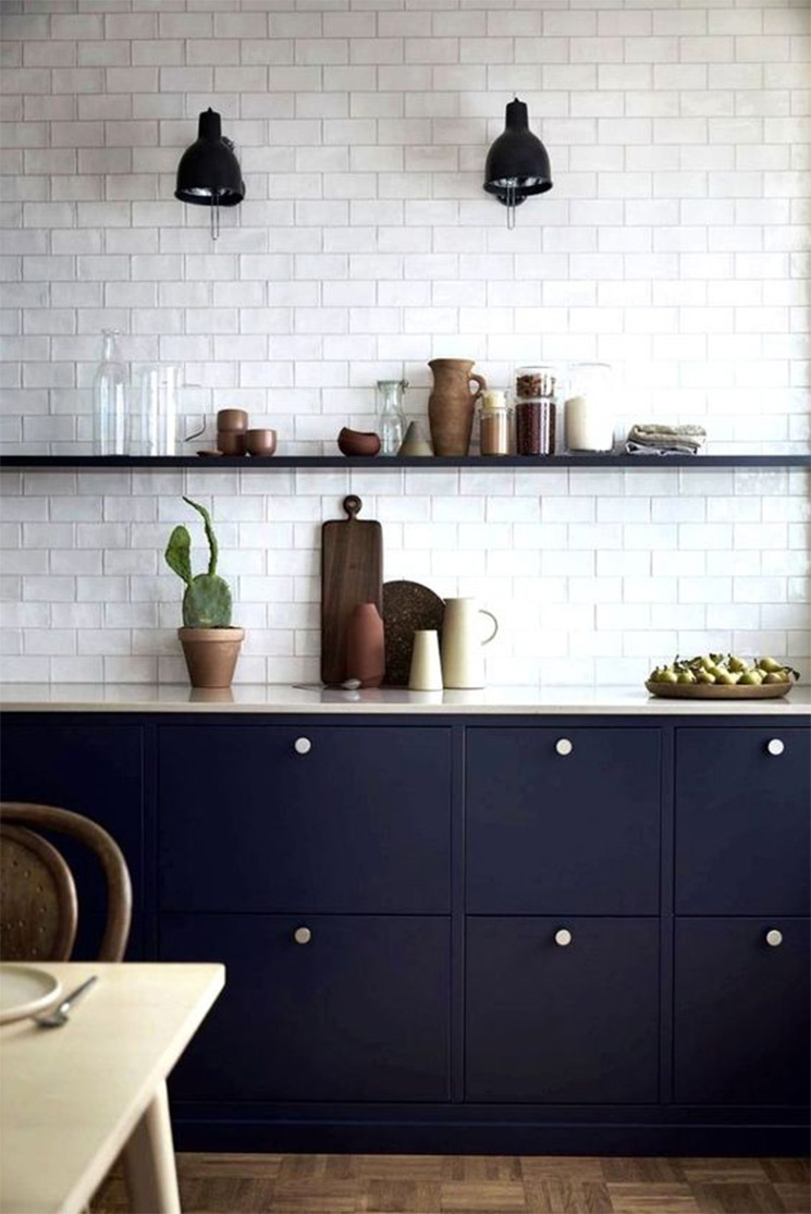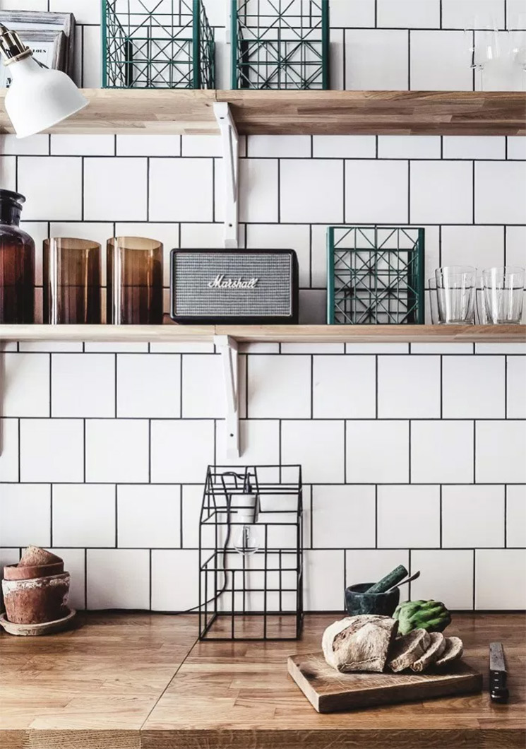 Les étagères en bois, placées au-dessus de la crédence donneront tout de suite un esprit atelier. Il n’est pas besoin de se ruiner, car pour donner un effet atelier, on choisit tout simplement des équerres en métal ou en bois et des planches de bois.