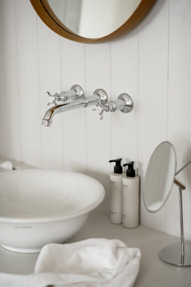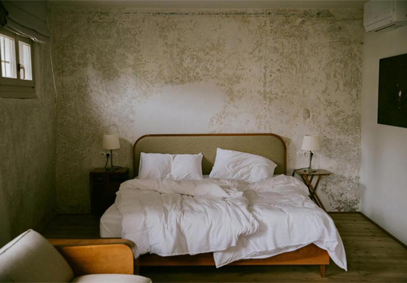 Ici, le minimalisme radical repose sur la restauration minutieuse des éléments d’époque, tels les boiseries patinées, les parquets cirés et les enduits d’origine. Le mobilier se résume à un savant mélange de pièces Mid-Century, d’antiquités italiennes et de trouvailles chinées, tandis qu’une photographie de Jasmine Deporta apporte une touche personnelle à chaque chambre.