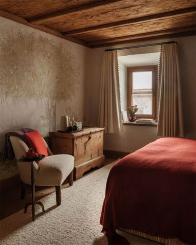 Changement d’atmosphère avec la Chesa Marchetta, une bâtisse du XVIe siècle à Sils Maria, Suisse, réinventée par le duo de galeristes Hauser & Wirth, fondateur du groupe hôtelier Artfarm. L’objectif de ce duo est de concevoir des hôtels singuliers, où l’expérience prime entre architecture, art et gastronomie.