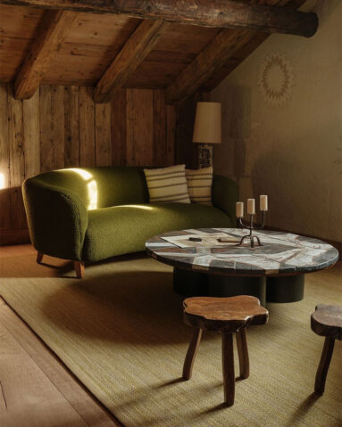Pour inviter la montagne chez soi, même en plein centre-ville, l’astuce n’est pas de transformer son salon en réplique de chalet, mais d’en extraire des codes précis : la chaleur des matériaux bruts (bois, pierre, cuir, laine), le confort absolu même sans feu de bois et et les références aux années 50-60, cette époque faste où la montagne a été gagnée par la folie du ski et du design moderniste.