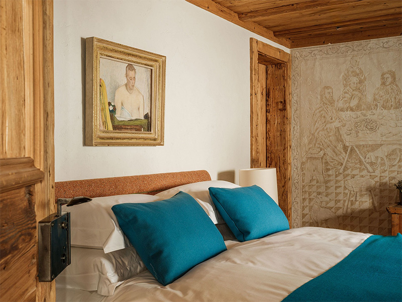 On y retrouve l’âme de l’Engadine avec ses plafonds bas en pin arole et ses murs épais. Cependant, l’espace est transfiguré par une collection d’art contemporain. Entre des meubles anciens sculptés et des tissus artisanaux, on croise des œuvres de Louise Bourgeois ou Nicolas Party.