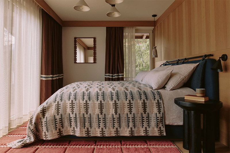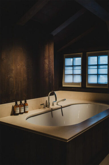 Ici, le studio d’architecture hollandais Nicemakers, fondé par Joyce Urbanus et Dax Roll, a voulu créer « un havre de paix pour ceux qui recherchent intimité et tranquillité, en privilégiant le confort et la tradition l’hospitalité suisse ». L’influence moderniste est partout : dans le mobilier chiné, les bois aux teintes de miel, et une palette chromatique terreuse et feutrée.