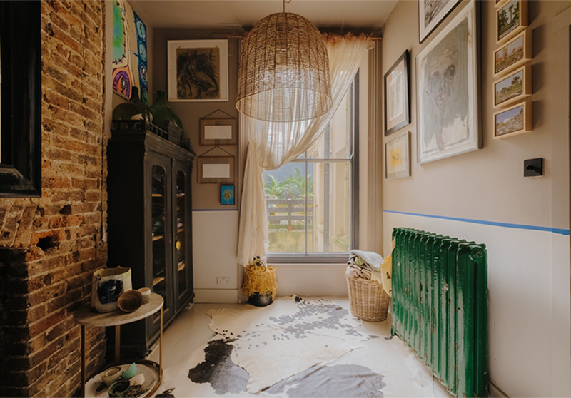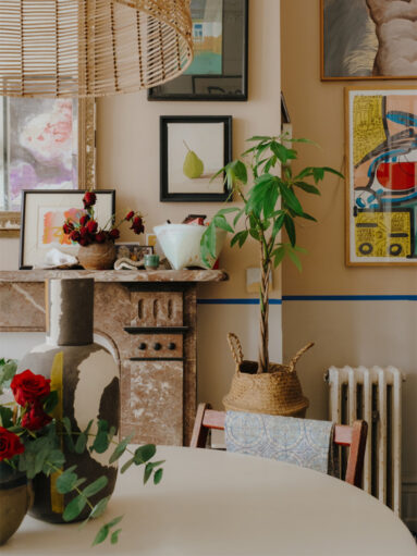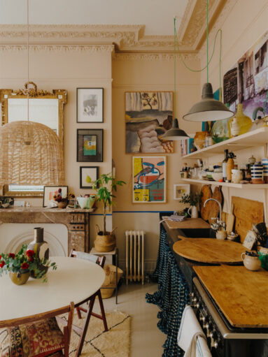 Alors, comment dire, je pense que les anciens propriétaires, ceux de l’époque victorienne feraient certainement une syncope en découvrant leur rez-de-chaussée, même si la période victorienne n’était pas exempte de bibelots, de plantes vertes et de tapis. C’est justement ce qui est intéressant ici. C’est ce foisonnement de créativité. Occupant le rez-de-chaussée d’une maison de ville victorienne mitoyenne sur Warrior Gardens, cet appartement de deux chambres avec jardin allie des détails d’époque préservés à une palette de matériaux et de couleurs affirmée.