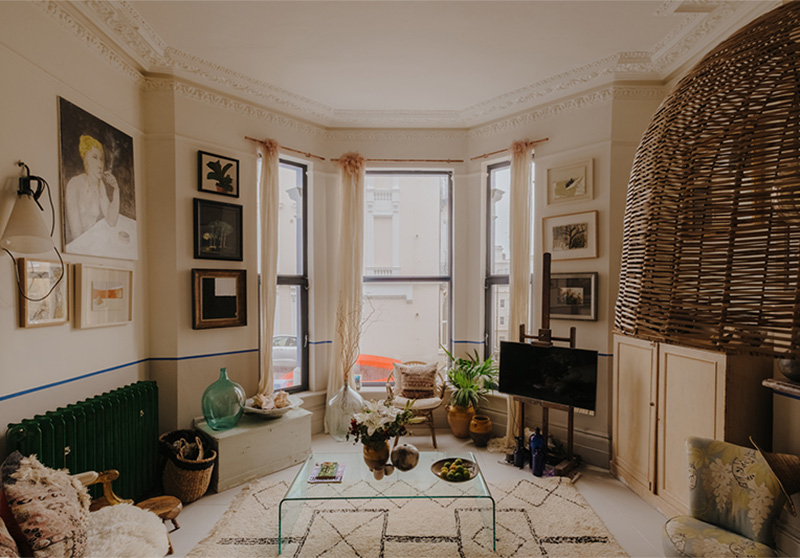 Le décor de cet appartement est incontestablement bohème dans une approche scandicraft, entendez entre ethnique chic et scandinave. Je rajouterai qu’il est en plus très anglais ! Bref, il est bohème, car il mélange. Il mélange œuvres d’art, rotin et vieilleries chinées, tapis de style Beni Ouarain, fleurs séchées et plantes vertes. Il est inventif. Partout, on sent le bricolage, la télévision calée dans un chevalet, le transformé en banquette…