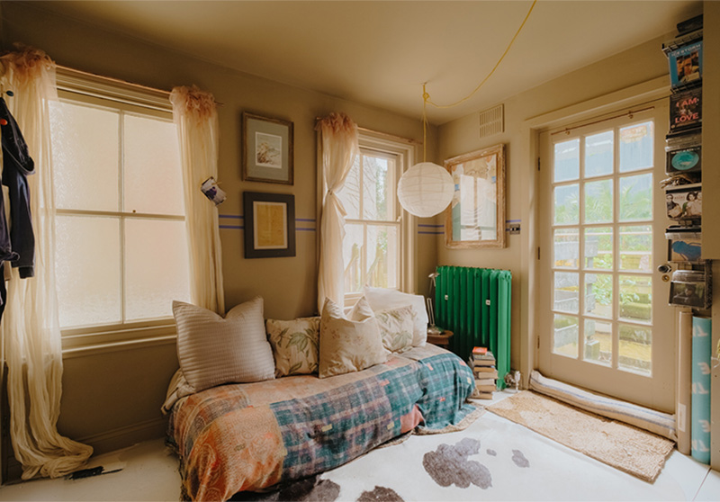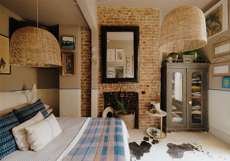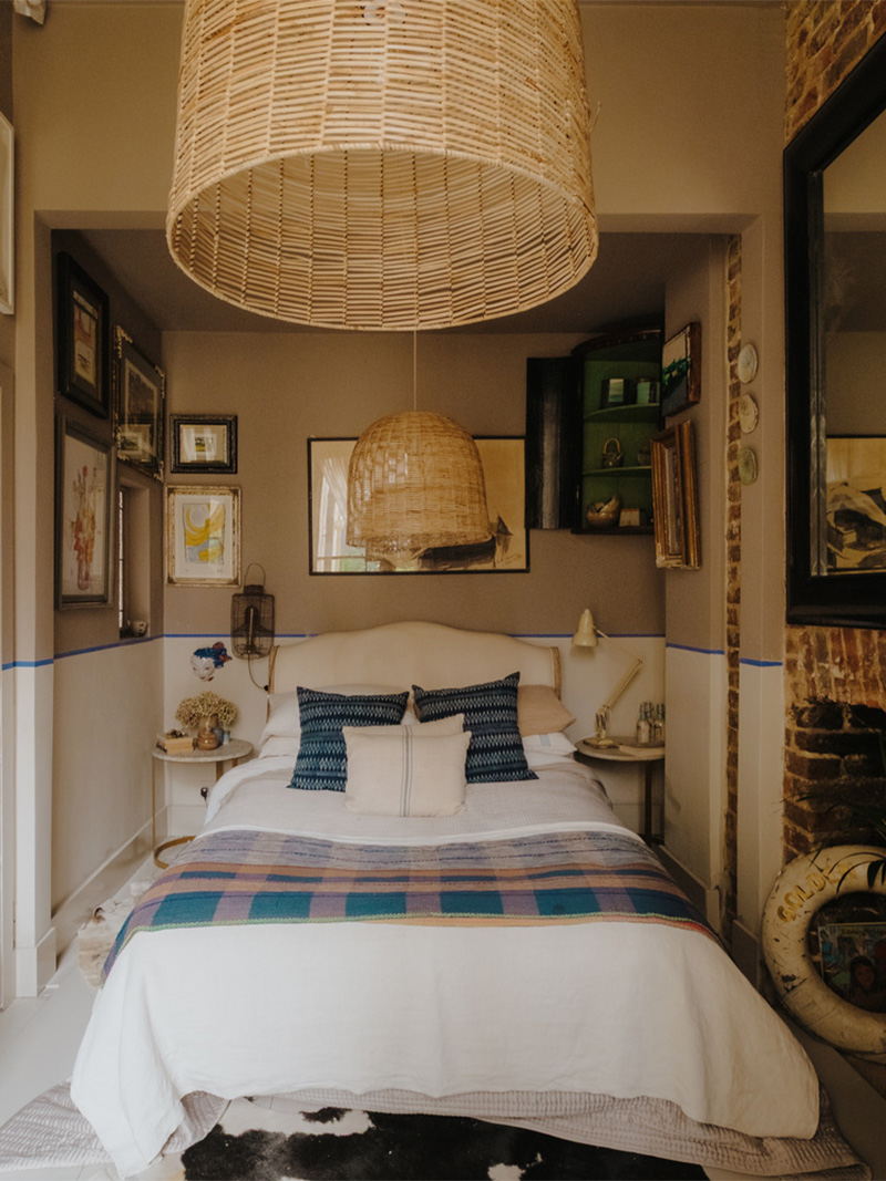 Comme nous l’avions vu dans la maison californienne la semaine dernière, tout est une question de « couches ». On superpose. Cela procède de la strate : un objet en amène un autre, puis un autre, puis un autre, jusqu’à faire sens. Un tapis sur un autre, une collection de cadres appuyés contre un mur, des textiles aux textures variées qui s’entremêlent sur un canapé. Ce sont ces couches successives qui créent cette impression de foisonnement bohème.