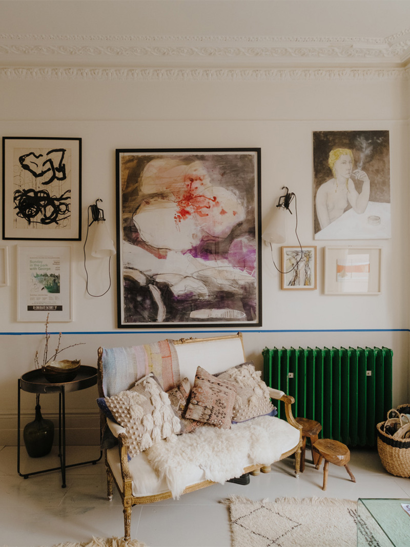Comme nous l’avions vu dans la maison californienne la semaine dernière, tout est une question de « couches ». On superpose. Cela procède de la strate : un objet en amène un autre, puis un autre, puis un autre, jusqu’à faire sens. Un tapis sur un autre, une collection de cadres appuyés contre un mur, des textiles aux textures variées qui s’entremêlent sur un canapé. Ce sont ces couches successives qui créent cette impression de foisonnement bohème.