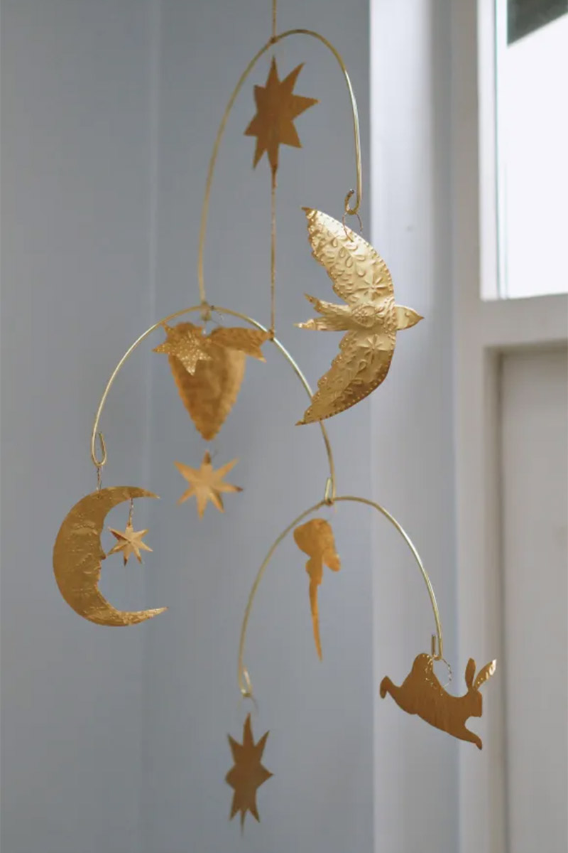 Pour Noël, une idée est d’adopter un mobile doré. Il en existe des tout faits dans le commerce, comme ceux de la marque Caravane en laiton. On peut aussi s’amuser à en fabriquer un comme
