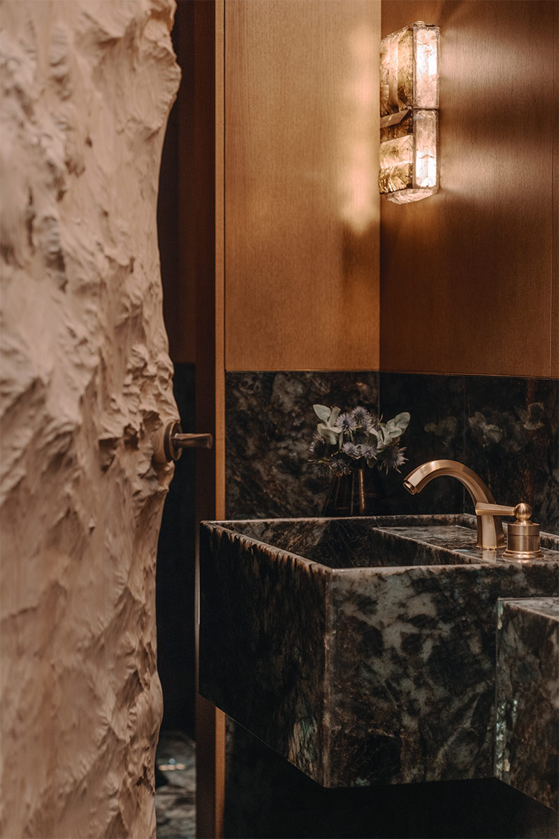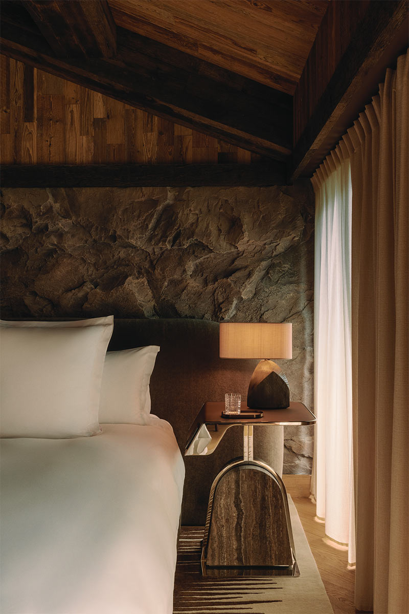 Si la décoration reprend les codes du style montagne, elle est contemporaine. Apportant sa signature sensorielle et raffinée, le designer français Tristan Auer marie matériaux naturels comme le bois et la pierre à des accents de cuivre et jeux de miroirs, insufflant une légèreté ludique à des espaces à la fois intimes et spectaculaires.