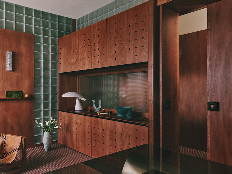 Il y a les murs, couverts d’okoumé, le carrelage à petits carreaux bordeaux au sol, les rideaux jupons ainsi que les pavés de verre sablés qui donne cette impression « seventies milieu de siècle ». Et il y a toutes ses meubles et objets qui font tout le piment du décor. La plupart proviennent de la galerie Memori Studio et cohabitent avec des créations désignées par le duo.