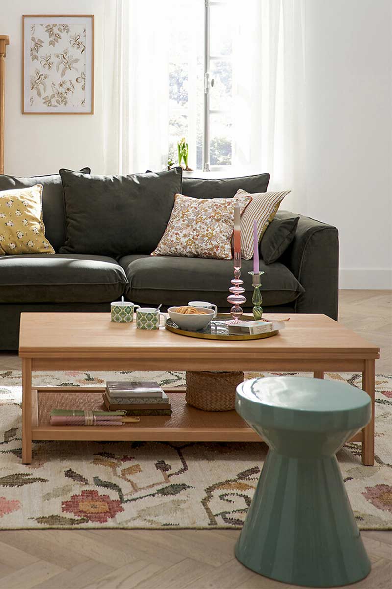 Le salon, c’est la pièce à vivre tout confort, où l’on aime passer du temps, seul ou avec sa famille et des amis. Nous devons pouvoir recevoir et accueillir. Je vous ai donc repéré des canapés soldés à mixer avec des fauteuils, des tables basses et des bouts de canapé. Pour la décoration, il est bon de multiplier les petits luminaires, d’avoir un bon tapis.