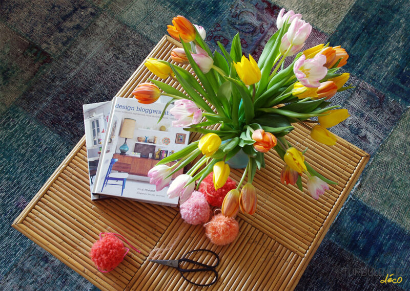 Le printemps s’est invité à la maison avec ce bouquet de fleurs. Au bouquet composé, je préfère, les choses simples comme ce bouquet de tulipes. Il reprend les couleurs des pompons que je suis en train de réaliser pour faire un pouf, peut-être un futur DIY, si j’arrive à aller au bout de mes projets. J’ai reçu également ces quelques fleurs de jonquilles qui sont venues égayer ma tapisserie « Colibri » et taquiner mon orchidée.